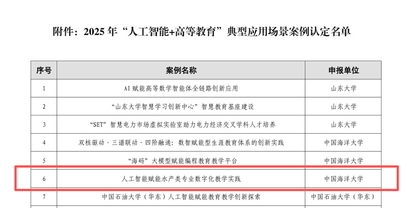 近日,山东省高等教育学会公布山东省2025年“人工智能+高等教育”典型应用场景案例认定名单,本次共认定55个案例。本中心申报的“人工智能赋能水产类专业数字化教学实践”案例入选。